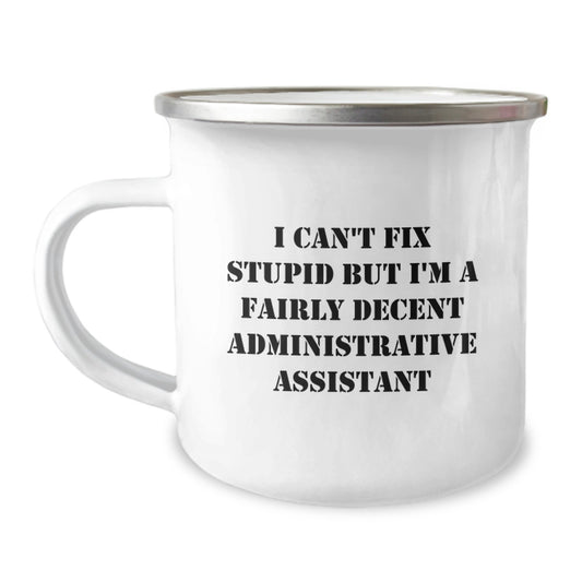 Gifts from Friends and Family for Administrative Assistant Birthday, I Can't Fix Stupid But I'm A Fairly Decent Administrative Assistant, Funny Camping Mug, 12 oz Stainless Steel