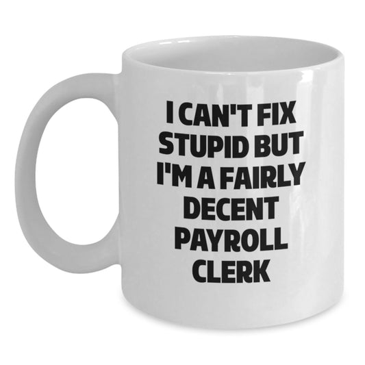 Funny Payroll Clerk Gifts - 'I Can't Fix Stupid But I'm A Fairly Decent Payroll Clerk' White Coffee Mug for Graduation, Gifts from Friends, Coworkers, or Family