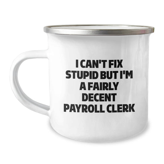 Funny Payroll Clerk Gifts - I Can't Fix Stupid But I'm A Fairly Decent Payroll Clerk, Graduation Mugs for Men, Women, Coworkers, Family, 12 oz Stainless Steel Enamel Finish