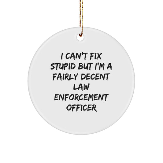 Funny Law Enforcement Officer Gifts from Friends for Christmas Circle Ornament with I Can't Fix Stupid But I'm A Fairly Decent Quote, Unique Present for Men and Women