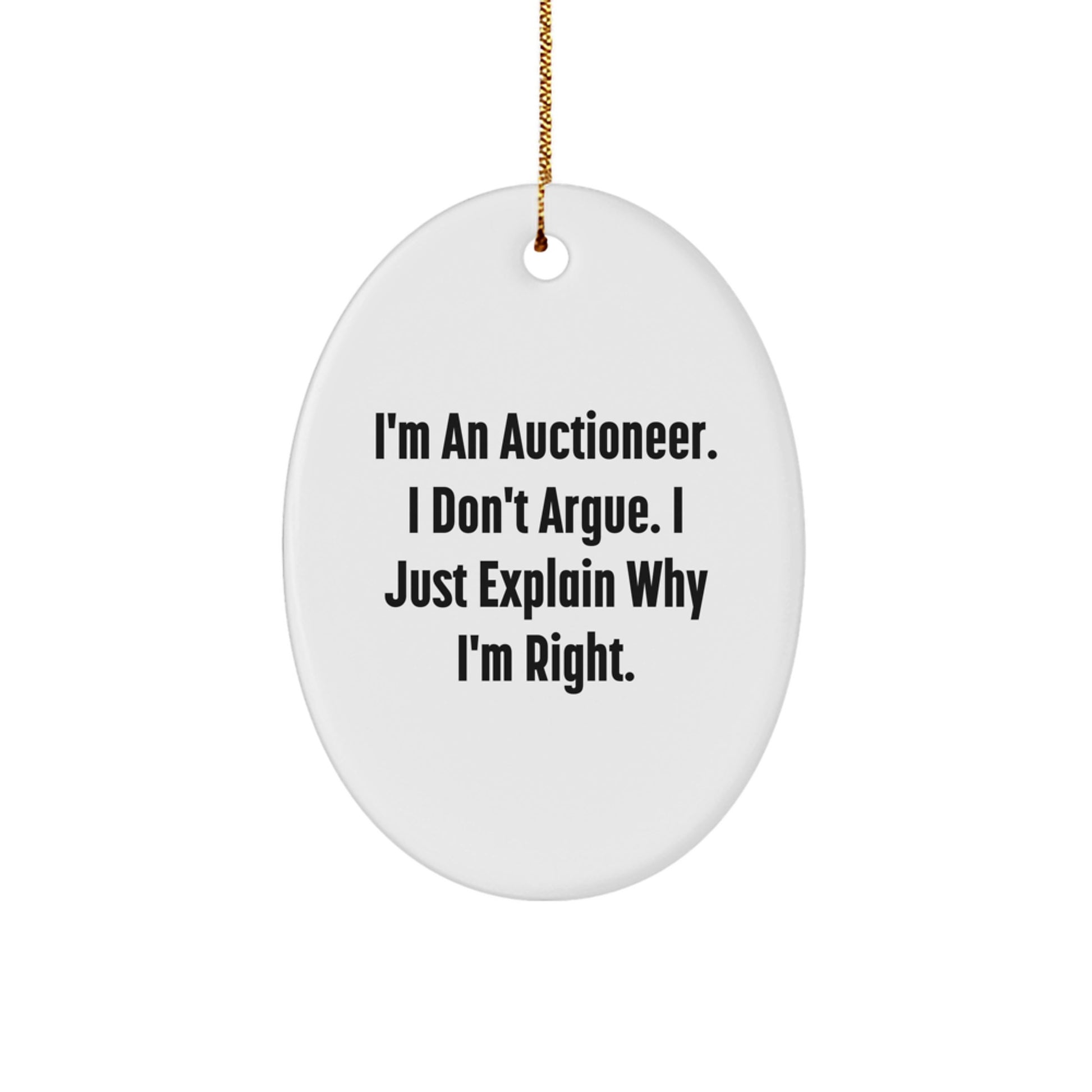 - The quote 'I'm An Auctioneer. I Don't Argue. I Just Explain Why I'm Right.' is expertly printed on the Oval Ornament, making it a thoughtful gift for any occasion.