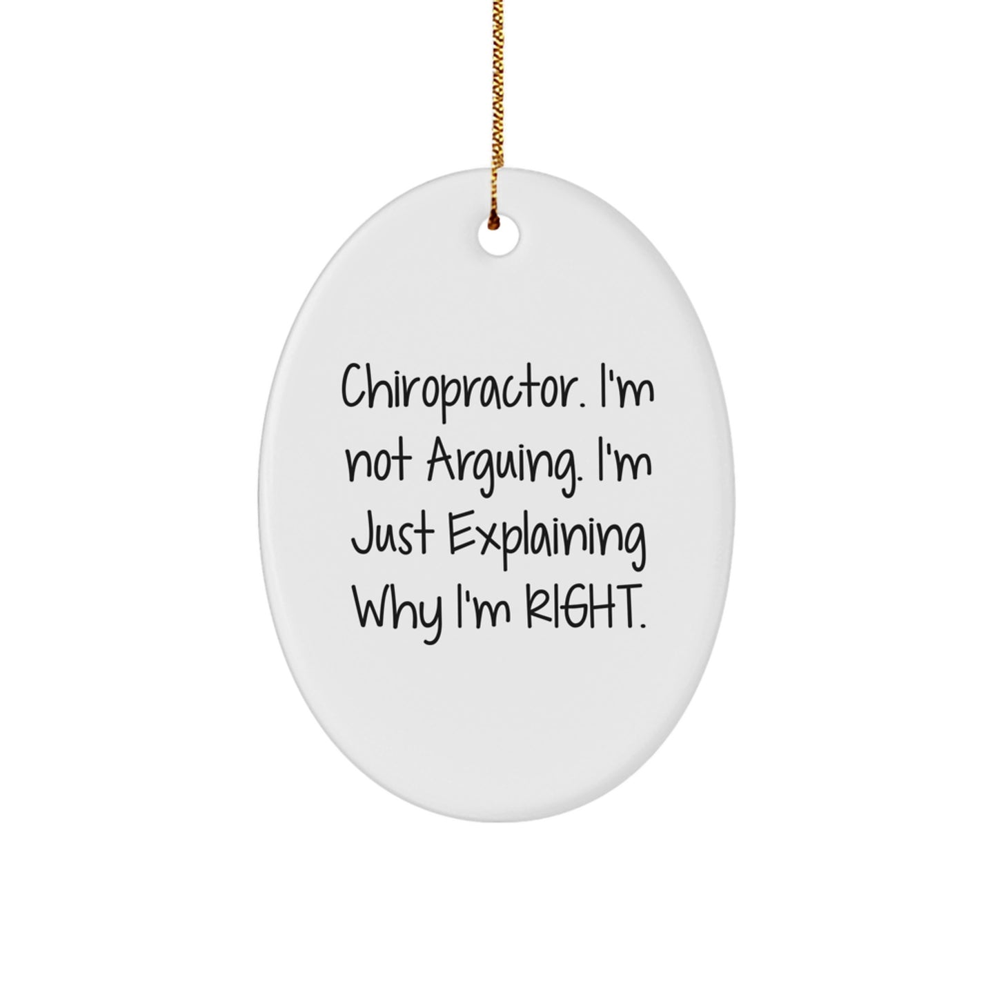 Are you tired of giving the same old boring gifts to your favorite chiropractor? Look no further! This funny oval ornament is a unique and thoughtful way to show your appreciation for their hard work. The quote 'I'm not arguing, I'm just explaining why I'm right' is a humorous way to poke fun at the sometimes heated debates that arise in the chiropractic field. Made from sturdy MDF with a high-gloss plastic finish, this ornament is lightweight and resistant to breaking, making it a great choice for households with children or pets. Plus, it's easy to hang with the included festive gold cord. Whether you're a chiropractor yourself or just appreciate the work they do, this ornament is the perfect way to spread some holiday cheer. So why settle for a boring gift when you can give a gift that's 'right' on the money?