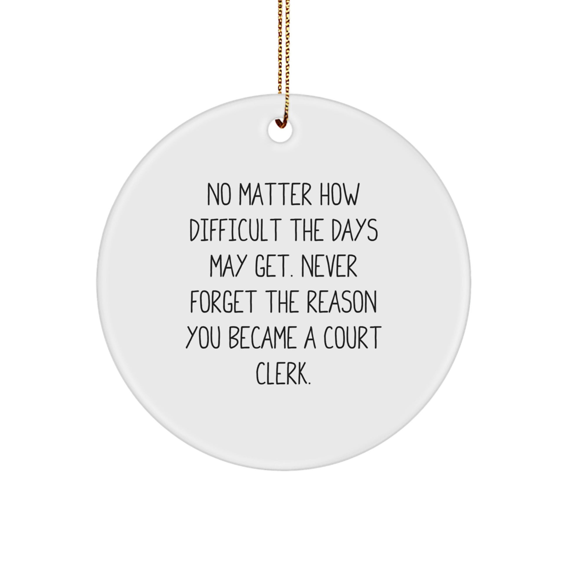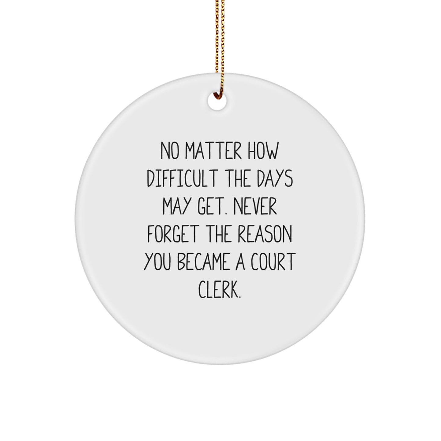 - The inspirational quote 'No Matter How Difficult The Days May Get. Never Forget The Reason You Became A Court Clerk.' is printed on the ornament in a vibrant, high-gloss finish