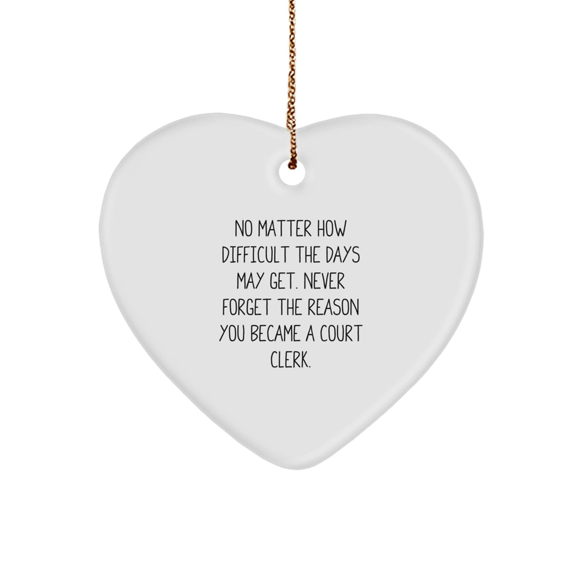 - 'No Matter How Difficult The Days May Get. Never Forget The Reason You Became A Court Clerk.' This heartwarming ornament is a thoughtful gift for any Court Clerk, reminding them of their dedication and hard work. With its vibrant colors and sturdy design, it's a beautiful addition to any office or home.