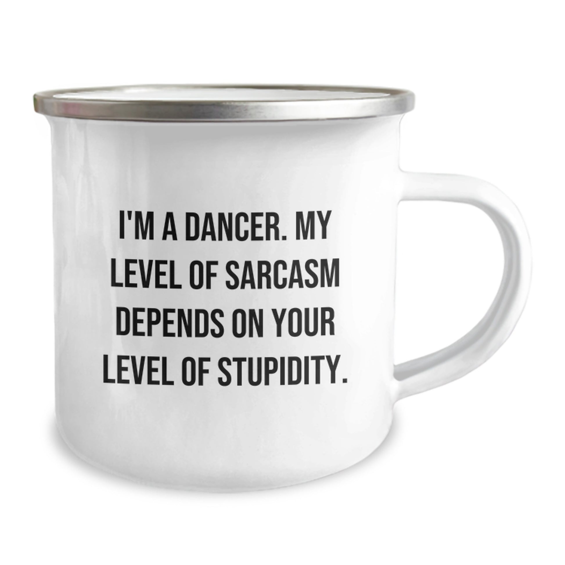 Are you a dancer looking for a unique gift? Or are you a friend, family, or coworker looking for a birthday present for a dancer? This funny quote camping mug is the perfect choice! With a 12 oz capacity and stainless steel with enamel finish, it's sturdy and easy to clean. The permanent printing won't fade after washing, so you can enjoy the hilarious quote for years to come. The quote, 'I'm A Dancer. My Level Of Sarcasm Depends On Your Level Of Stupidity.' is sure to bring a smile to any dancer's face. Whether you're a seasoned pro or just starting out, this mug is the perfect way to show off your love for dancing. So grab a cup of coffee or tea and get ready to dance your way to a great day!