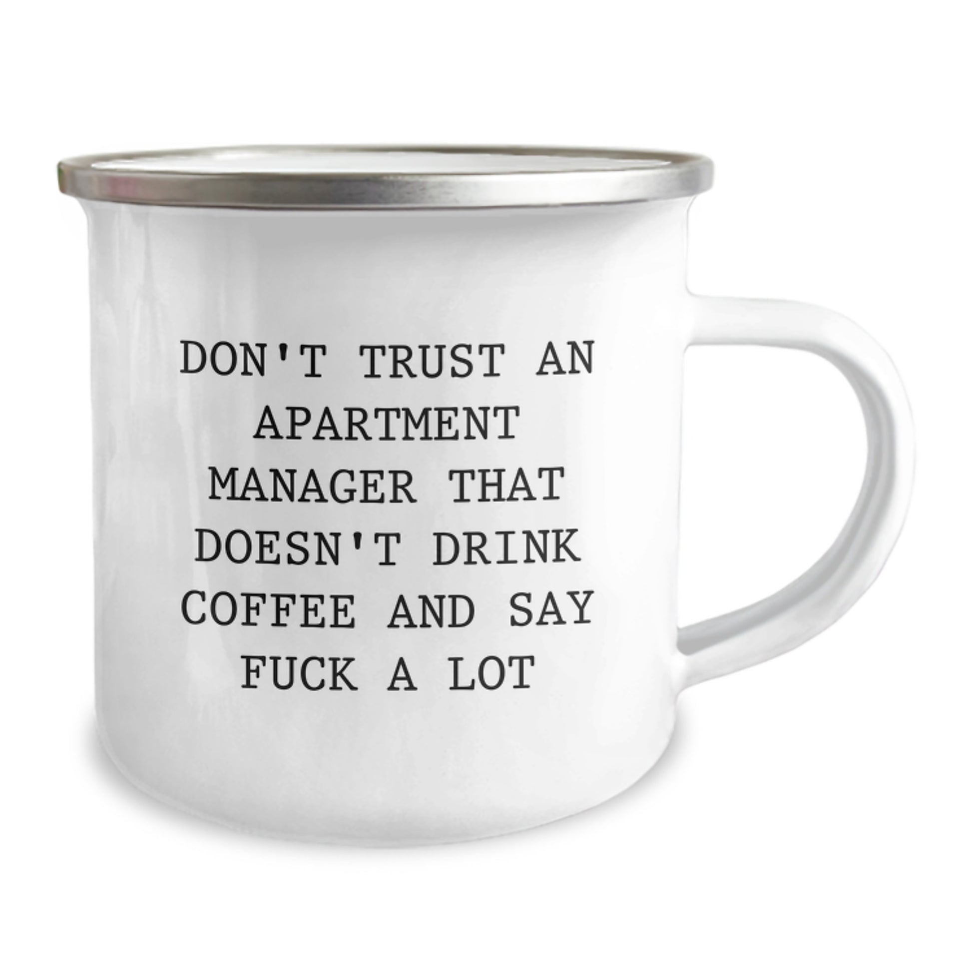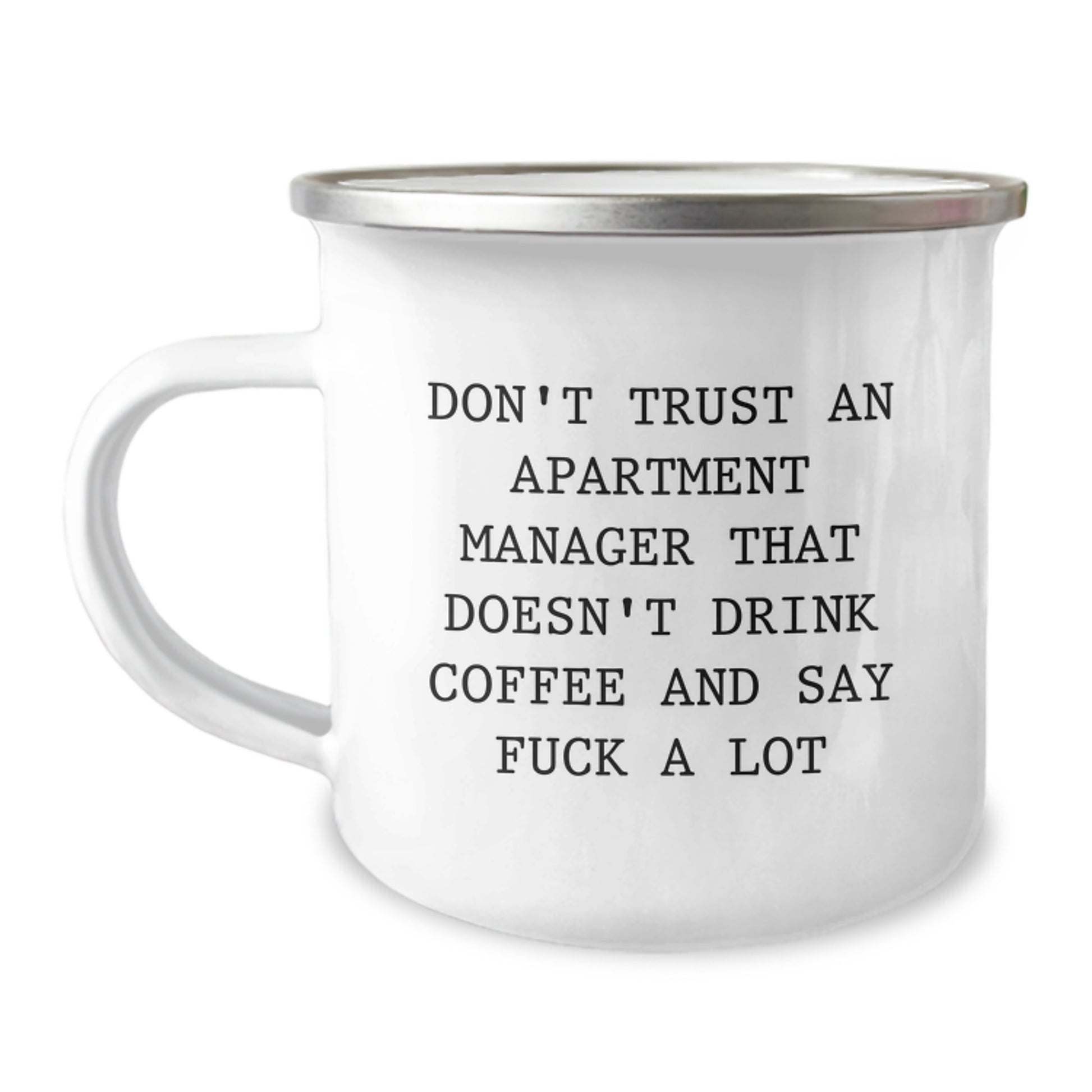 - This camping mug is the ideal gift for Apartment Managers who love coffee and a good laugh. With its unique quote, it's sure to bring a smile to their face. The stainless steel with enamel finish and 12 oz capacity make it sturdy and easy to clean.