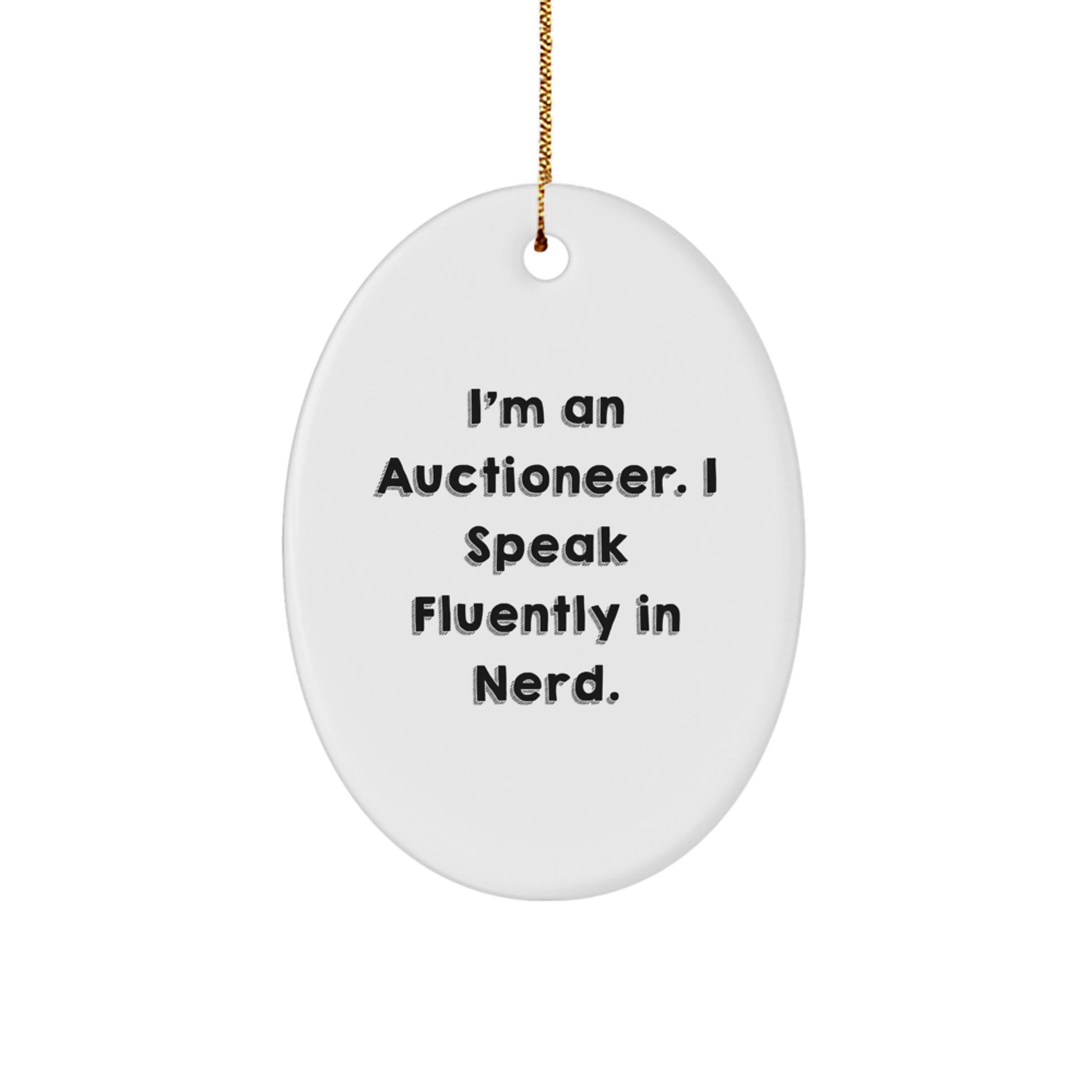 - Elevate your holiday decor with this unique Auctioneer Oval Ornament, featuring vibrant colors and a sleek design that's sure to impress friends and family. 'I'm An Auctioneer. I Speak Fluently In Nerd.' quote adds a touch of whimsy to your Christmas tree or mantel. Perfect for Auctioneer enthusiasts and anyone looking to add a personal touch to their holiday decor.