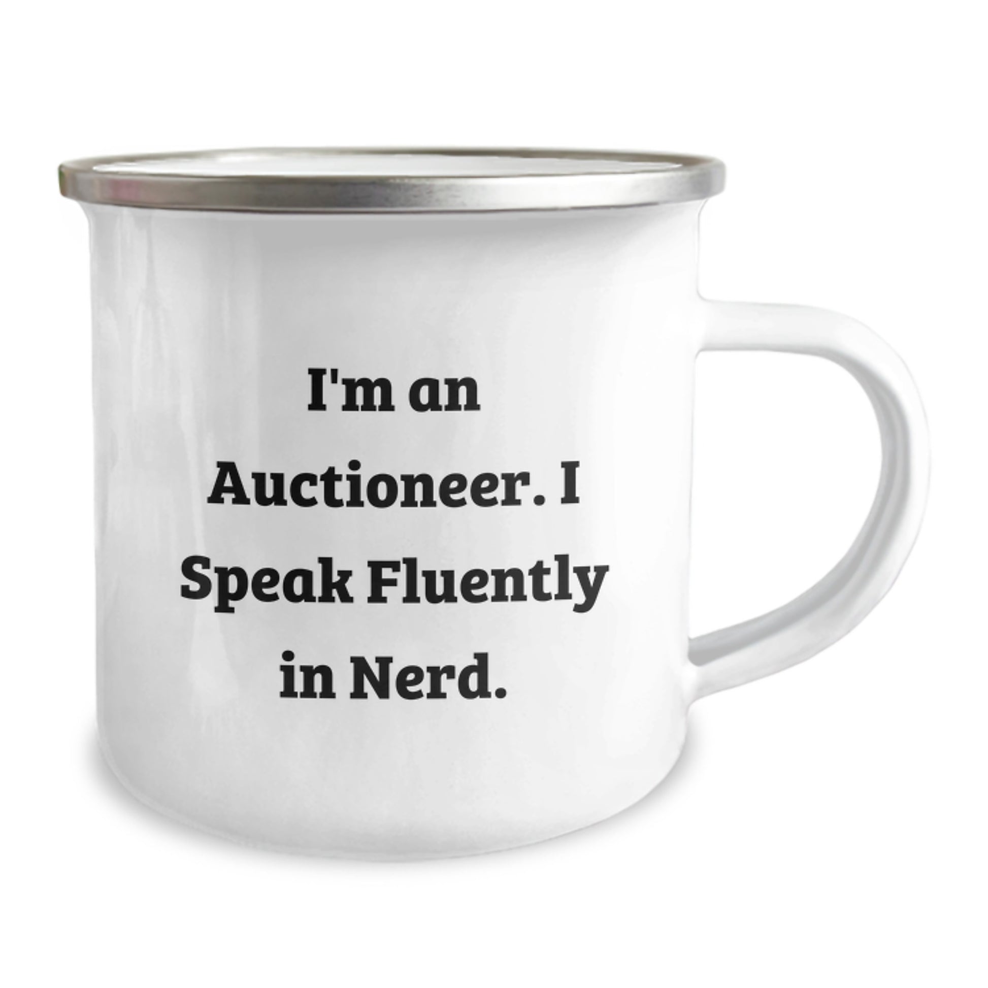 - Elevate your camping trips with this unique 'I'm An Auctioneer. I Speak Fluently In genius.' Camping Mug, designed specifically for auctioneers on-the-go. Enjoy your favorite hot or cold beverages in style, perfect for sipping on while recounting tales of successful bidding wars. The 12 oz capacity is ample for a refreshing drink after a long day of auctions.