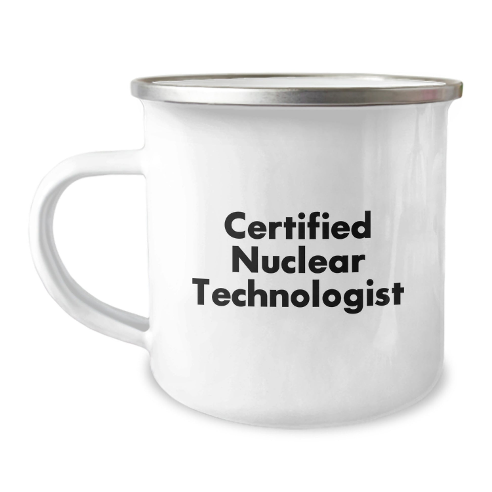 - Perfect gift for the Nuclear Technologist in your life, this 'Certified Nuclear Technologist' themed camping mug is a thoughtful way to celebrate their birthday. With a 12 oz capacity, it's the perfect size for a warm cup of coffee or tea on a chilly morning.