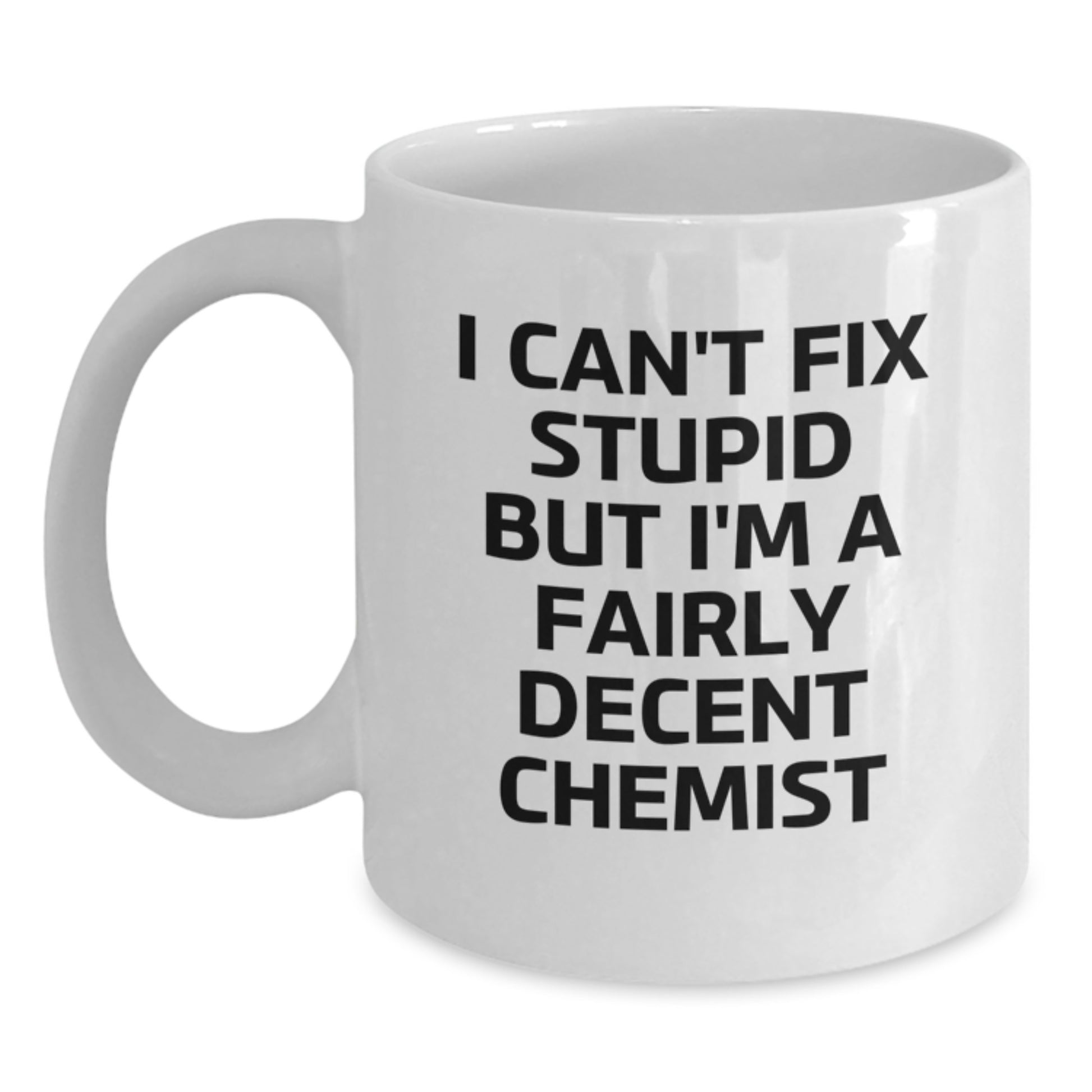 Funny Chemist Gifts for Friends, Coworkers, or Family - 'I Can't Fix Stupid But I'm A Fairly Decent Chemist' White Coffee Mug, Graduation Unique Gifts from Men, Women, Family