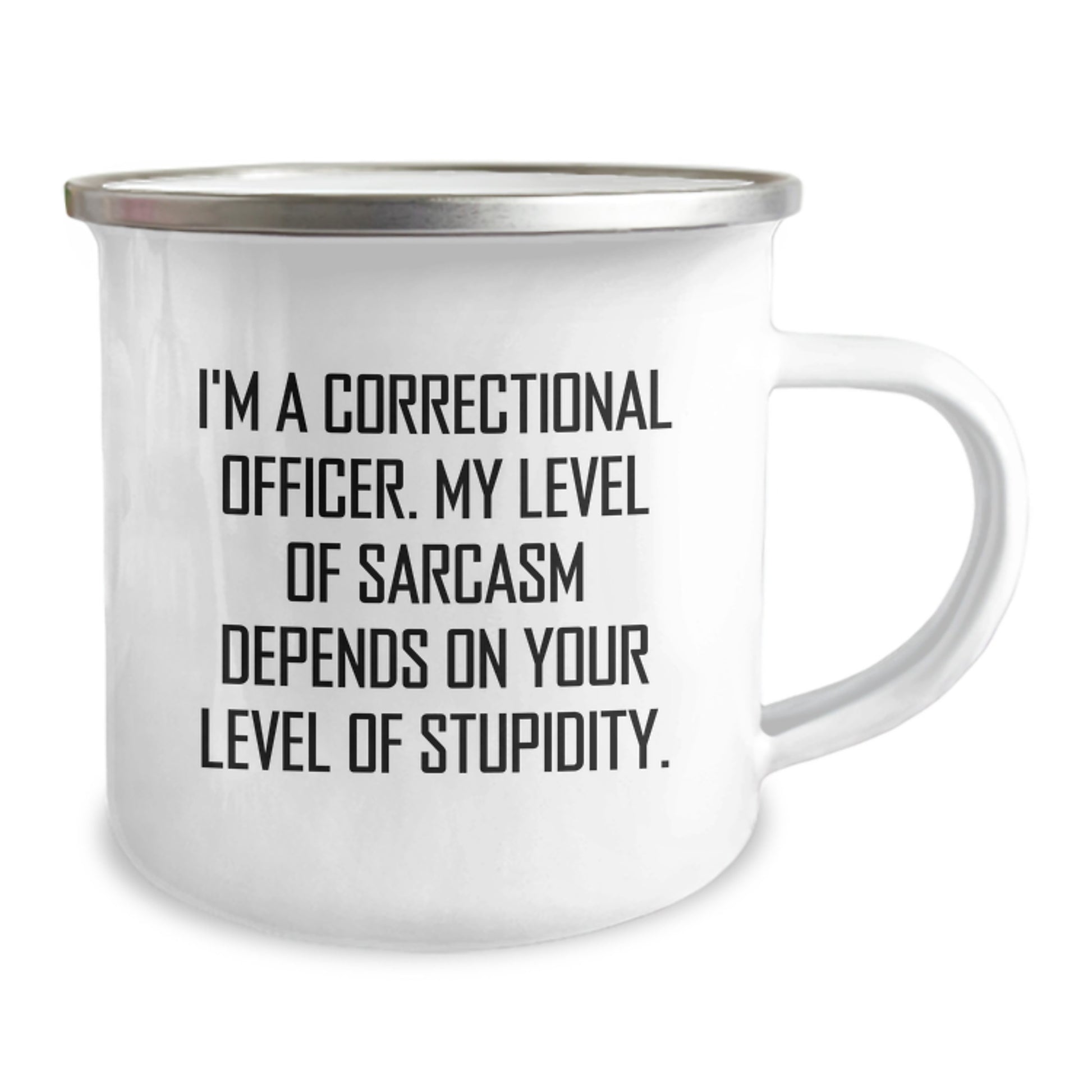 - This camping mug is a hilarious way to show off your sense of humor and appreciation for correctional officers. The quote 'I'm A Correctional Officer. My Level Of Sarcasm Depends On Your Level Of Stupidity.' is a great conversation starter and will bring a smile to the face of any correctional officer. The mug is sturdy and easy to clean, making it a great addition to their daily routine. Whether it's a birthday gift or just a token of appreciation, this mug is sure to be a hit. '