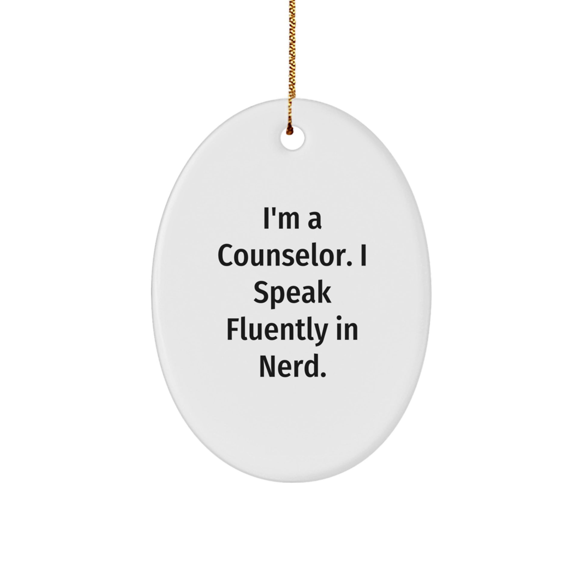 - This unique Oval Ornament is a fun and quirky way to acknowledge the counselor's dedication to their profession. With its funny quote 'I'm A Counselor. I Speak Fluently In genius.' , this ornament is sure to bring a smile to their face.