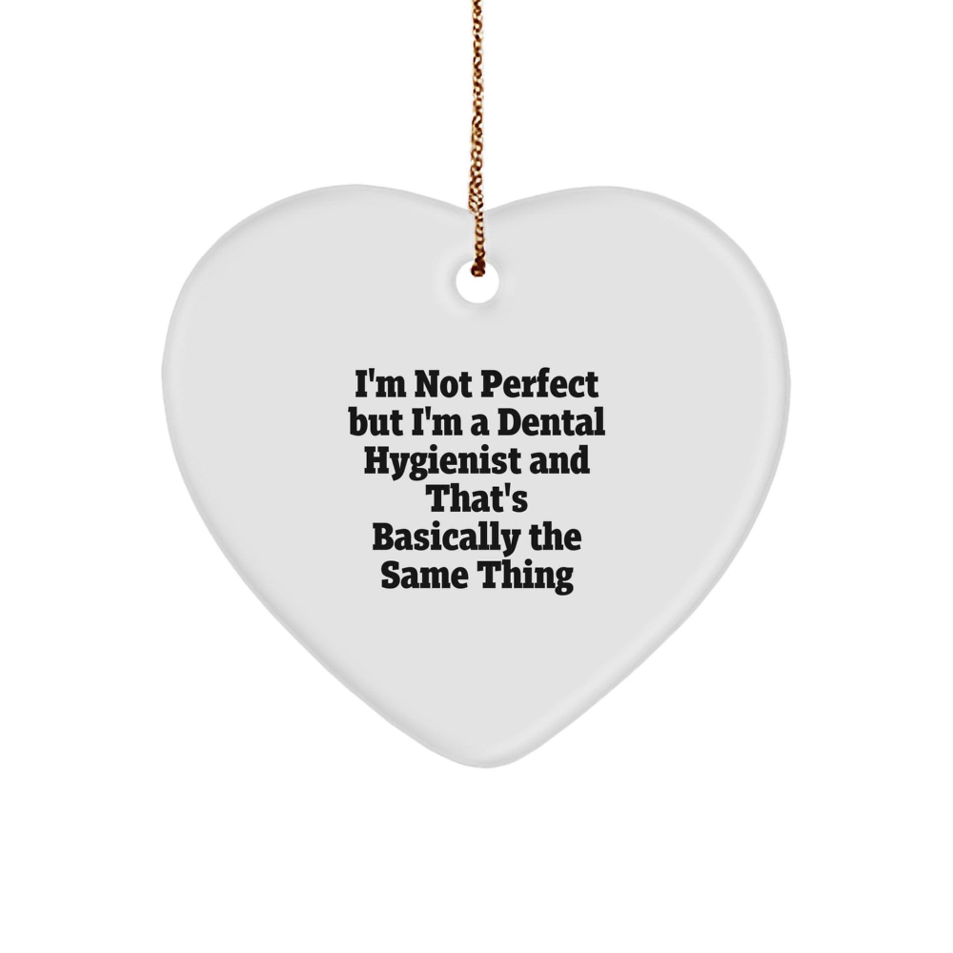 - Make a statement with this funny heart-shaped ornament featuring the quote 'I'm Not Perfect But I'm A Dental Hygienist And That's Basically The Same Thing' - a ideal gift for dental hygienist friends who will appreciate the humor.