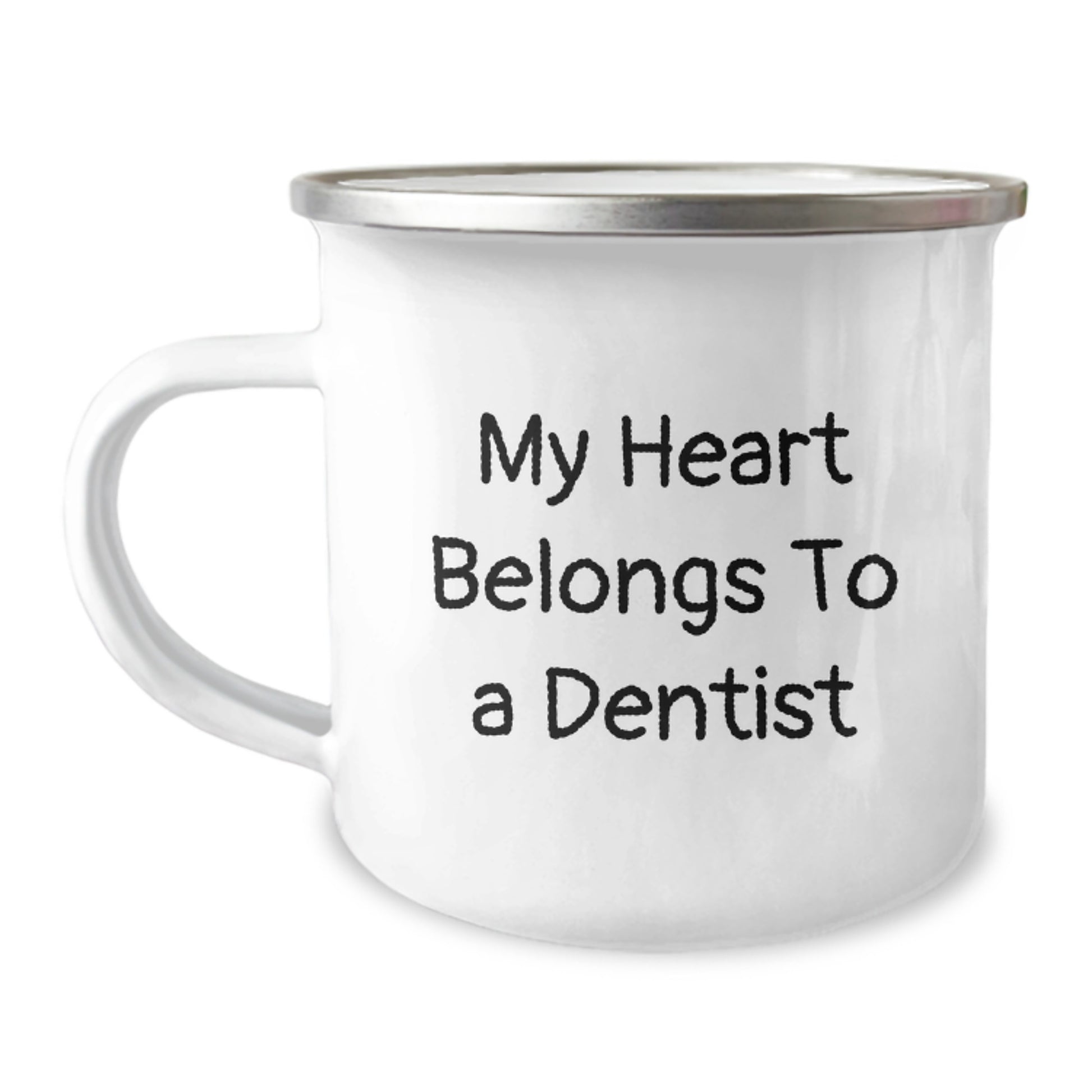 - Make a statement with this unique 'My Heart Belongs To A Dentist' camping mug, perfect for the dental professional in your life. Its stainless steel with enamel finish ensures durability and ease of cleaning. Whether you're a dentist or just appreciate the dental profession, this thoughtful gift is sure to bring a smile to their face.