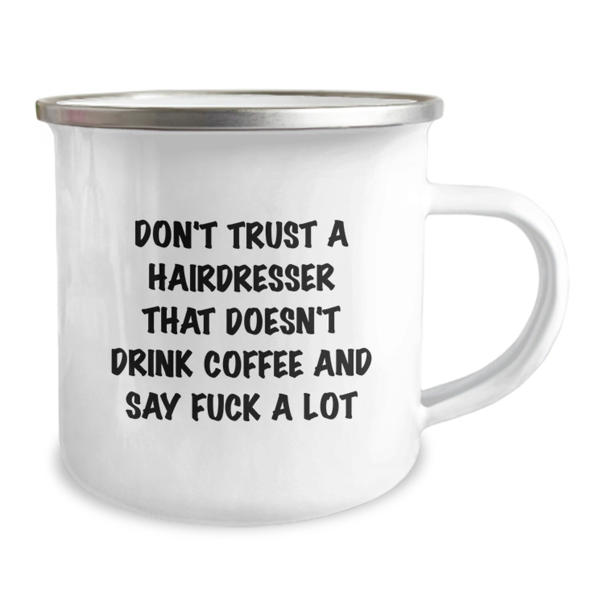 This camping mug is a great way to show off your hairdresser's personality and sense of humor. And with its 12 oz capacity, it's perfect for hot coffee or tea on a chilly morning. So why wait? Get your 'Don't Trust A Hairdresser That Doesn't Drink Coffee And Say F--k A Lot' Camping Mug today and make your hairdresser's day a little brighter!
