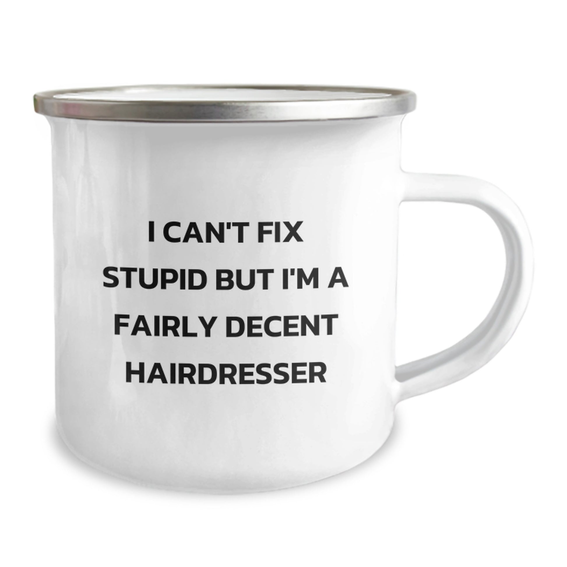 - Show your appreciation for the hairdresser in your life with this funny camping mug, featuring the hilarious quote 'I Can't Fix Stupid But I'm A Fairly Decent Hairdresser'. Perfect for any hairdresser, this mug is a great way to show your support and appreciation for their hard work and dedication.