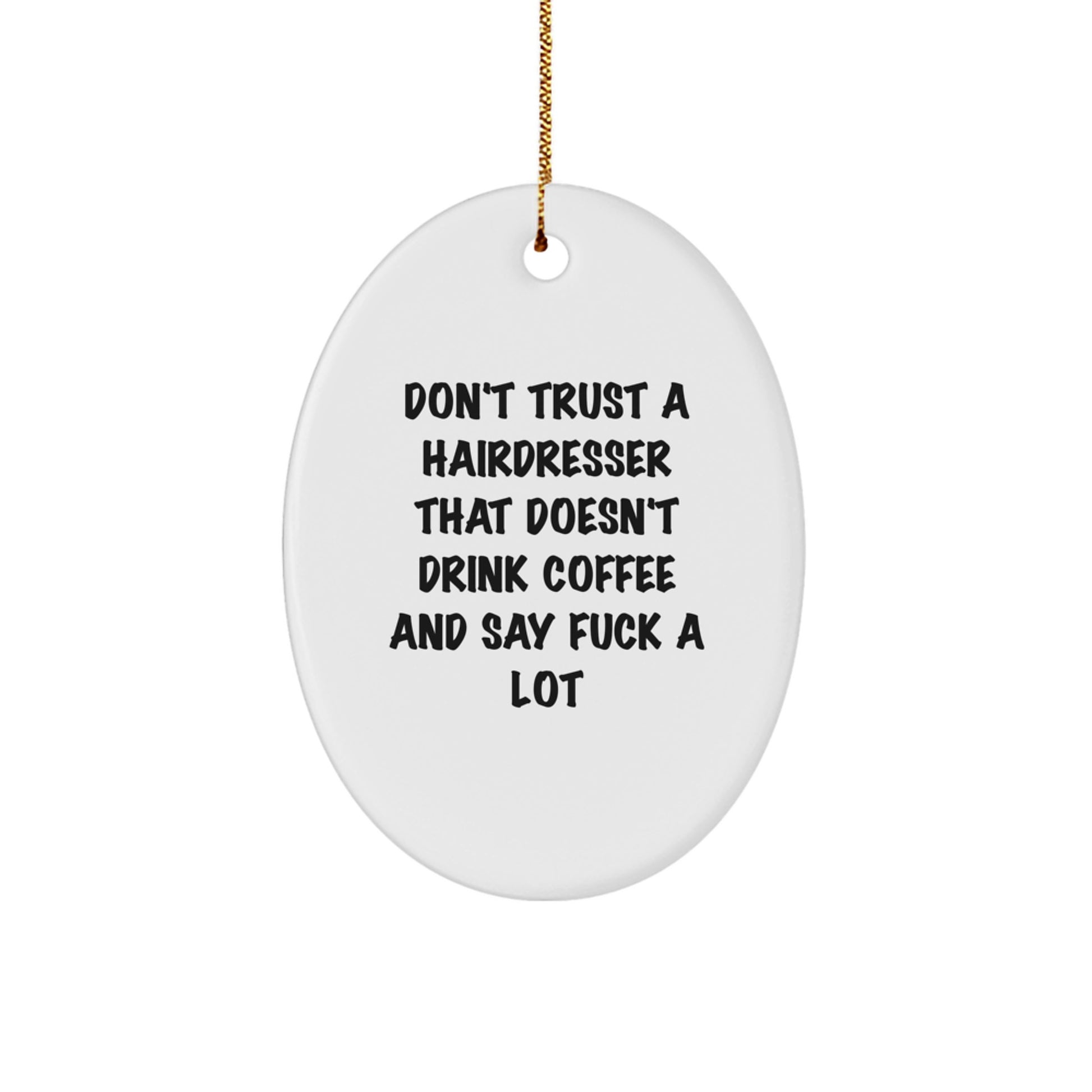 Get ready to crack up with this hilarious oval ornament! Don't trust a hairdresser who doesn't drink coffee and say 'fuck a lot' - a funny quote that will make you laugh out loud. Perfect for hairdresser enthusiasts or anyone who loves a good joke. Make it a Christmas gift for your favorite hairdresser or a funny token for your coworkers. This oval ornament is crafted from sturdy MDF with a high-gloss plastic finish, ensuring a long-lasting design. Vibrantly printed from edge-to-edge via Sublimation, it's lightweight and resistant to breaking. Ships with a festive gold cord for easy hanging, perfect for stress-free decorating. So, go ahead and spread some holiday cheer with this quirky gift!