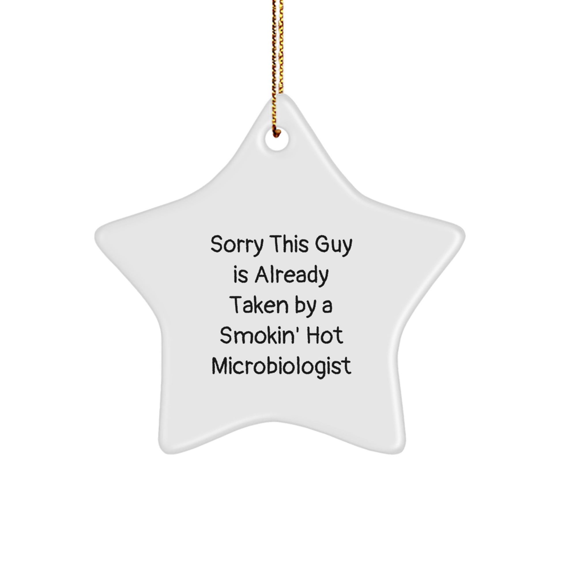 Get ready to crack up with this hilarious Microbiologist-themed star ornament! Sorry This Guy Is Already Taken By A Smokin' Hot Microbiologist is the ideal gift for the microbiologist in your life. This white, star-shaped ornament features a funny quote that's sure to bring a smile to their face. Made from sturdy MDF with a high-gloss plastic finish, it's lightweight and resistant to breaking, making it a great choice for households with children or pets. Ships with a festive gold cord for easy hanging, perfect for stress-free decorating. Whether you're shopping for a Christmas gift for a microbiologist or just want to add some humor to your holiday decor, this star ornament is the perfect choice.