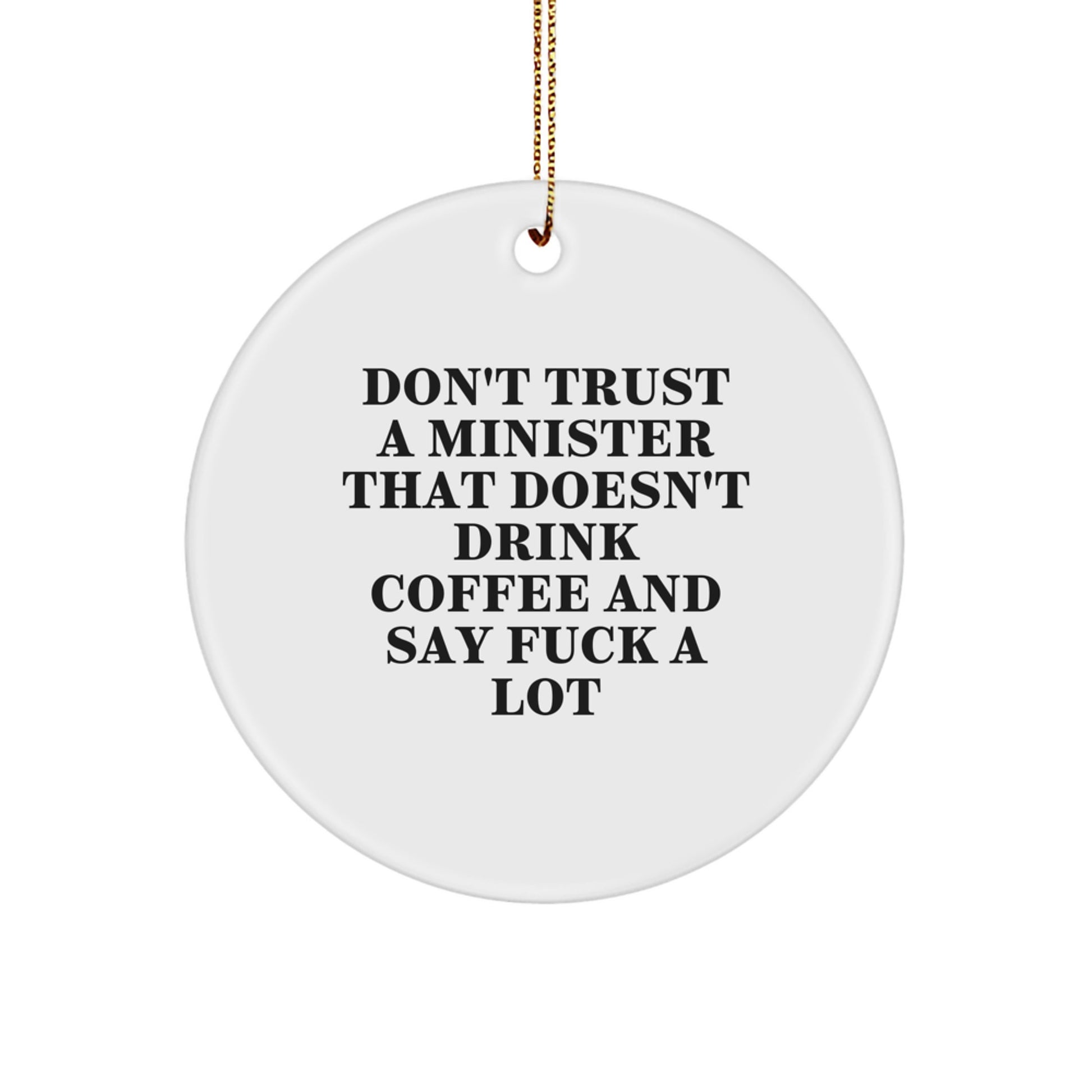 - This Circle Ornament is the perfect way to add some personality to your Christmas decor, with its unique design and humorous quote. Don't trust a minister that doesn't drink coffee and say 'fuck a lot', so why not start with this funny and quirky gift? It's a great way to show off your minister's sense of humor and add some laughter to the holiday season.