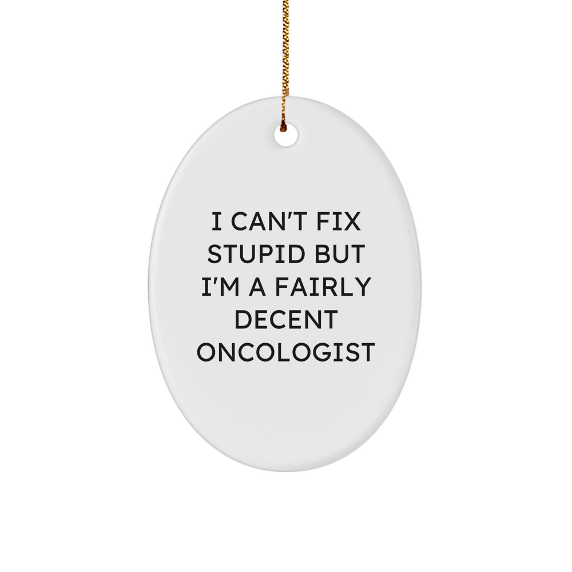 - This funny oval ornament is a great way to show your appreciation for the oncologist in your life, whether it's a friend, family member, or coworker. The quote 'I Can't Fix Stupid But I'm A Fairly Decent Oncologist' is a humorous take on the challenges of being an oncologist and is sure to bring a smile to their face.