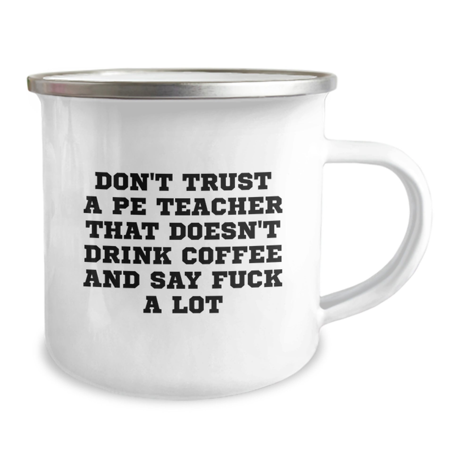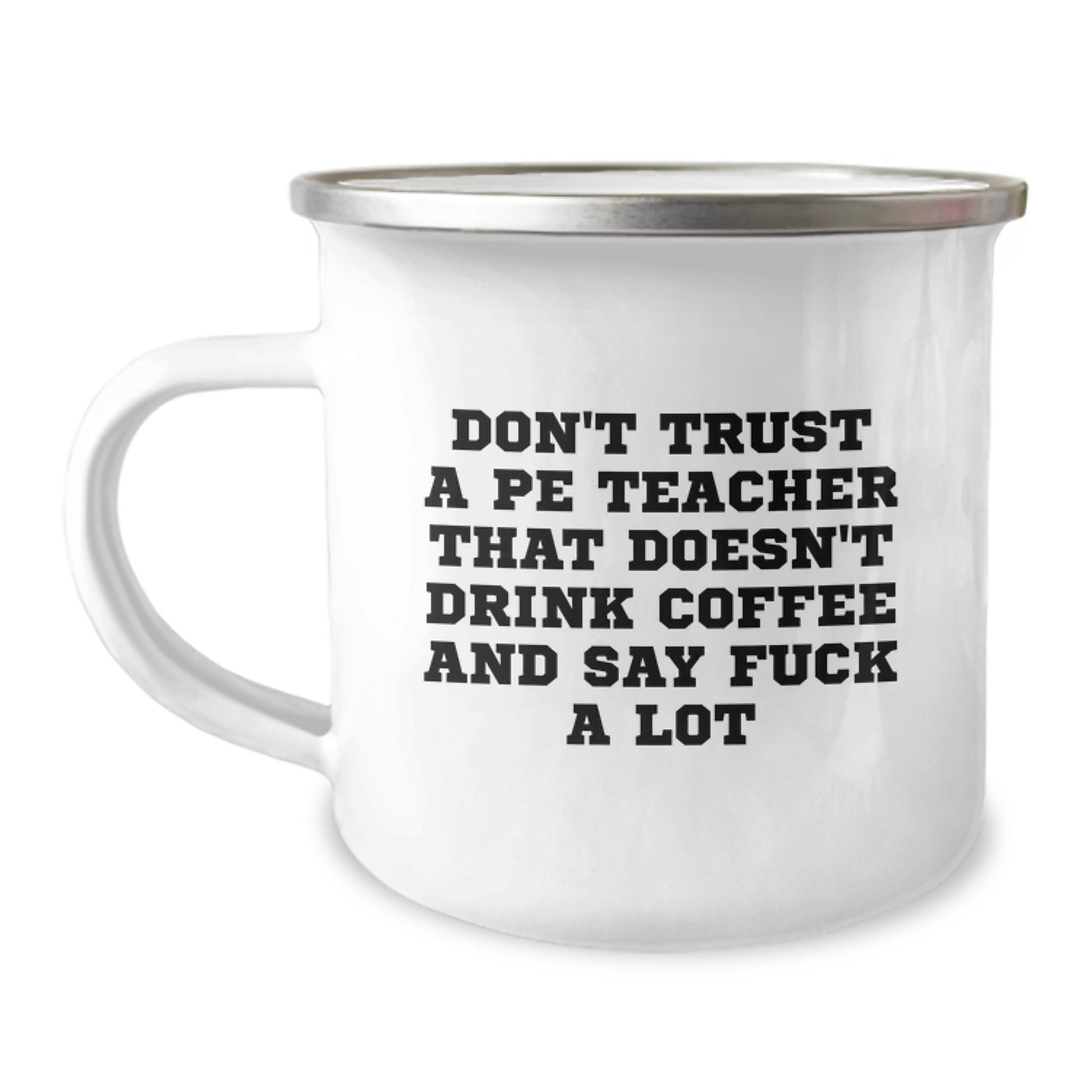 Are you looking for a unique gift for the PE teacher in your life? Do you want to make them laugh and feel appreciated? Look no further! This hilarious camping mug is the perfect way to show your appreciation for their hard work and dedication. The quote 'Don't Trust A PE Teacher That Doesn't Drink Coffee And Say 'F--k A Lot'' is a humorous take on the typical PE teacher stereotype, and is sure to bring a smile to their face.