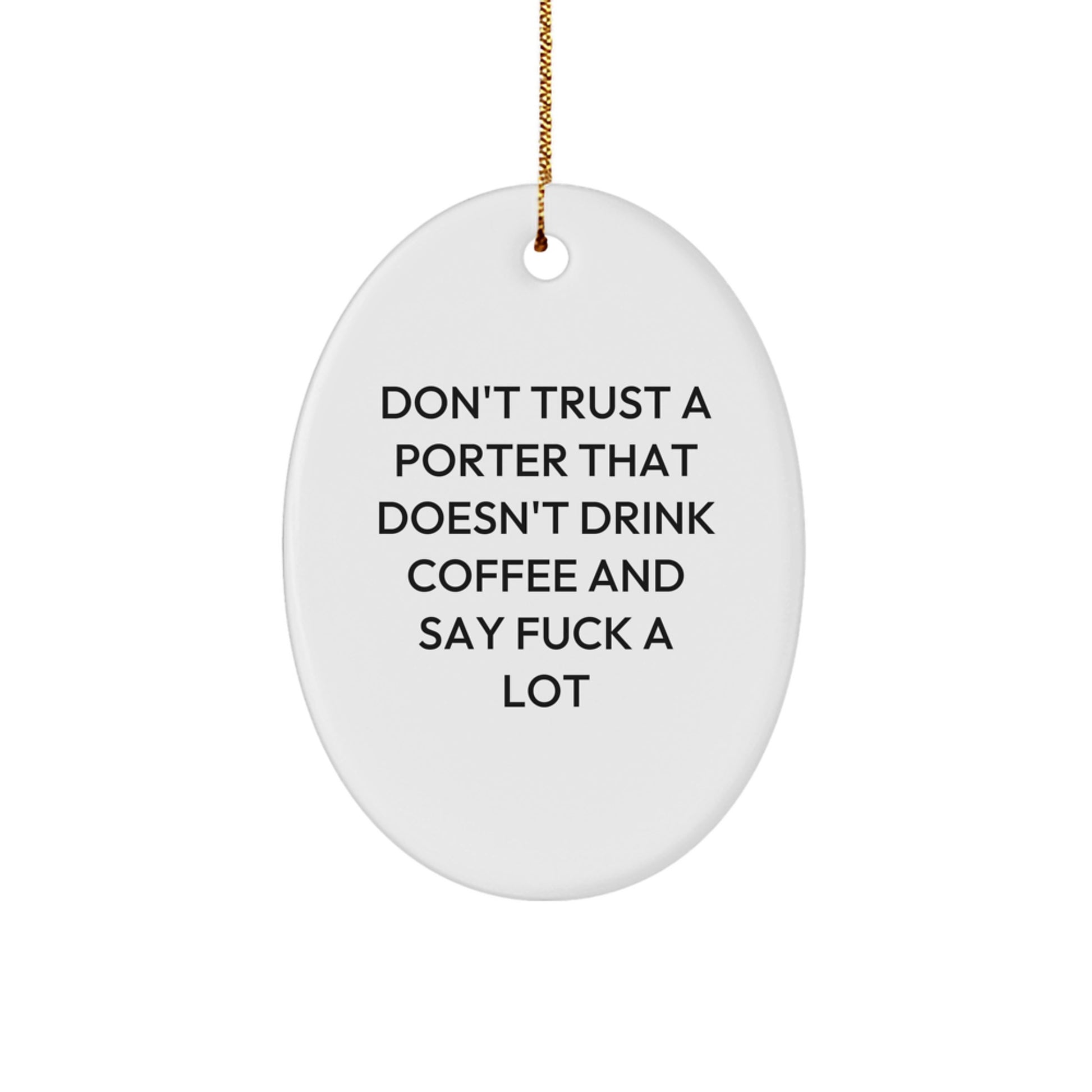 Get ready to laugh with this hilarious Porter-themed oval ornament! A unique gift for Porter enthusiasts and anyone who loves a good quote. The quote 'Don't Trust A Porter That Doesn't Drink Coffee And Say F--k A Lot' is a funny and relatable saying that will bring a smile to anyone's face. This oval ornament is crafted from sturdy MDF with a high-gloss plastic finish, ensuring a long-lasting design that will withstand the test of time. Vibrantly printed from edge-to-edge via Sublimation, this ornament is lightweight and resistant to breaking, making it a great choice for households with children or pets. Perfect for decorating your Christmas tree or giving as a gift to a friend or family member.