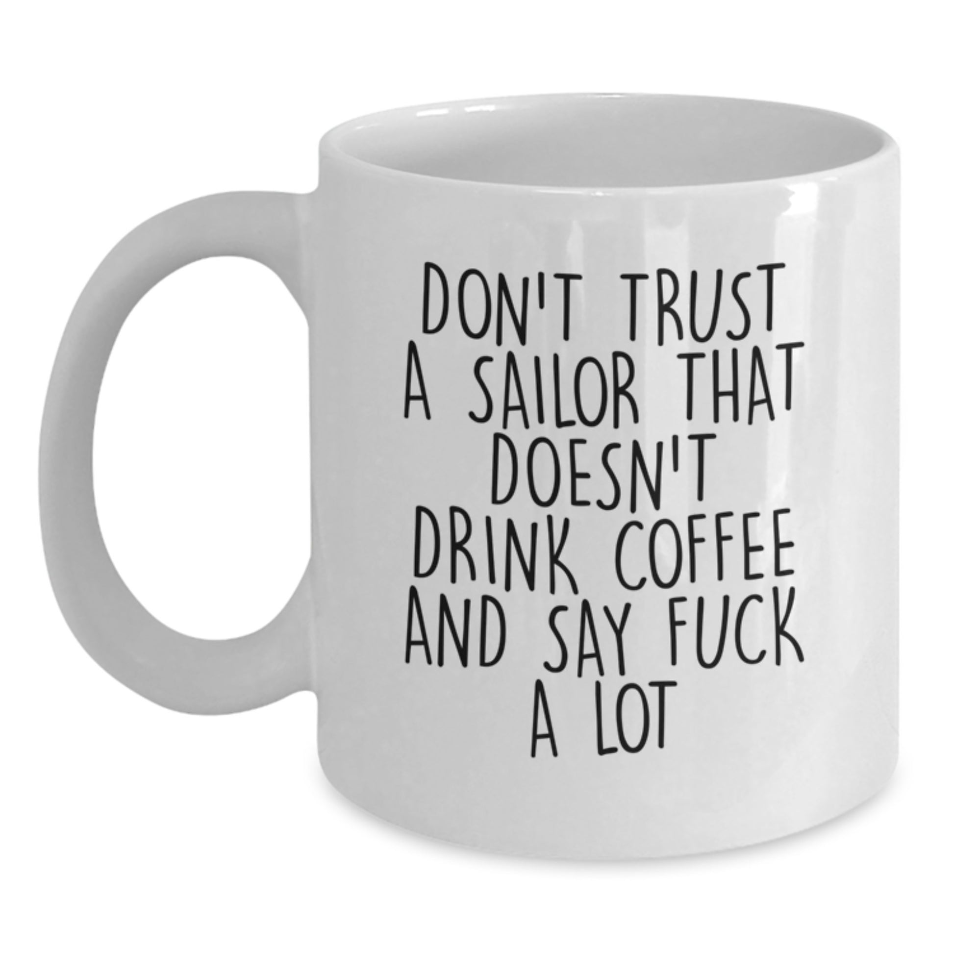 Are you looking for a unique gift for the sailor in your life? Look no further! This funny coffee mug is perfect for any sailor enthusiast. The quote 'Don't Trust a Sailor That Doesn't Drink Coffee And Say F--k A Lot' is a funny and relatable saying that any sailor would love. This white coffee mug is made from ceramic and is dishwasher and microwave safe. It's a great gift for any occasion, including graduation.
