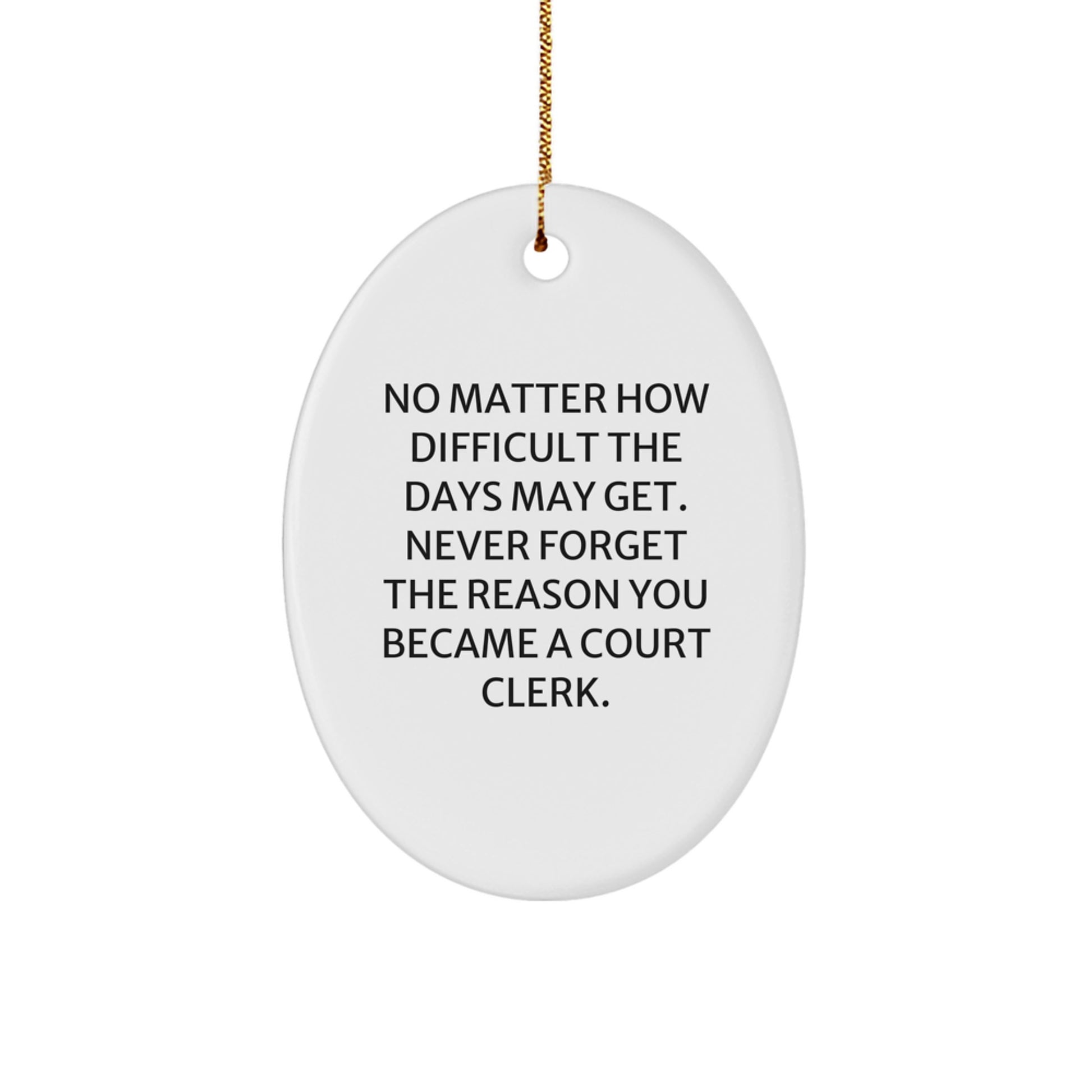 - This Oval Ornament is the perfect way to show appreciation for Court Clerks' hard work and dedication, with its inspirational quote 'No Matter How Difficult, Never Forget The Reason You Became A Court Clerk'