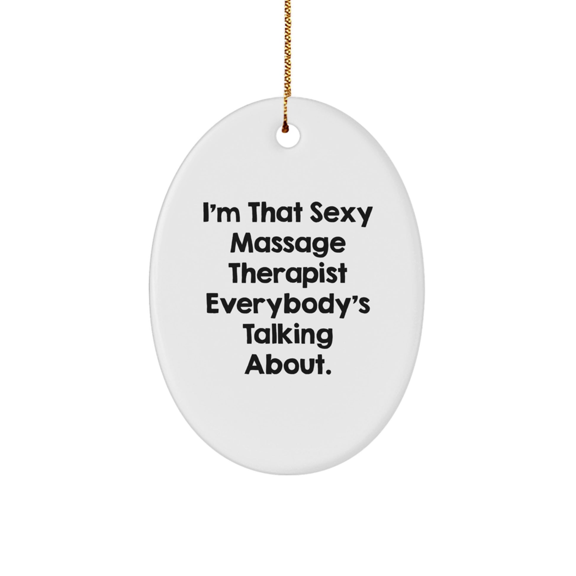 - Add a personal touch to your holiday decor with this one-of-a-kind oval ornament, featuring the quote 'I'm That Sexy Massage Therapist Everybody's Talking About.' Perfect for framing or hanging on your tree, it's a beautiful conversation piece that will be cherished for years to come.