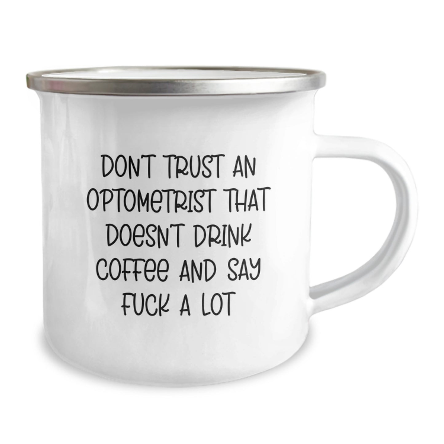 Optometrist Gifts, Funny Quote, Camping Mug for Birthday, Gifts from Friends to Optometrist, 12 oz Stainless Steel with Enamel Finish, Don't Trust an Optometrist, Funny Birthday Unique Gift
