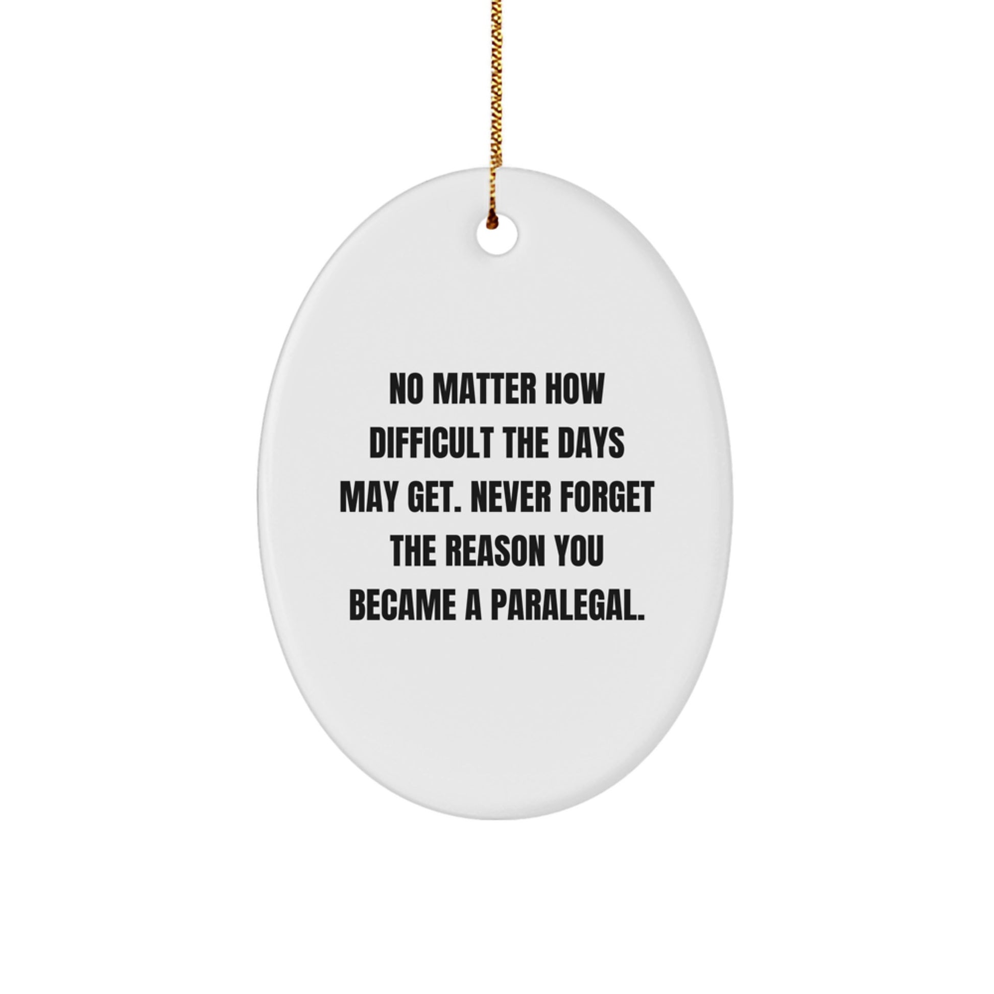 - Brighten up their holiday season with this inspiring and uplifting oval ornament, featuring the quote 'No Matter How Difficult The Days May Get. Never Forget The Reason You Became A Paralegal.'