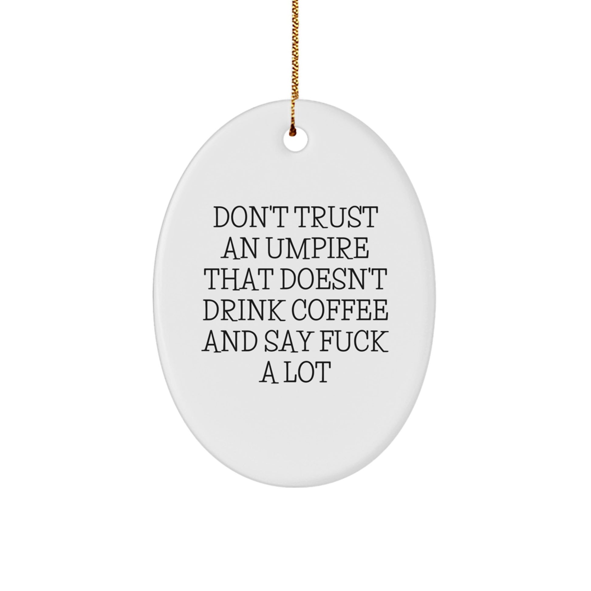 Are you an Umpire enthusiast or looking for a unique gift for the Umpire in your life? Look no further! This funny oval ornament is the perfect addition to any home or office. With its vibrant design and hilarious quote, 'Don't Trust an Umpire That Doesn't Drink Coffee And Say F--k A Lot', it's sure to bring a smile to anyone's face.