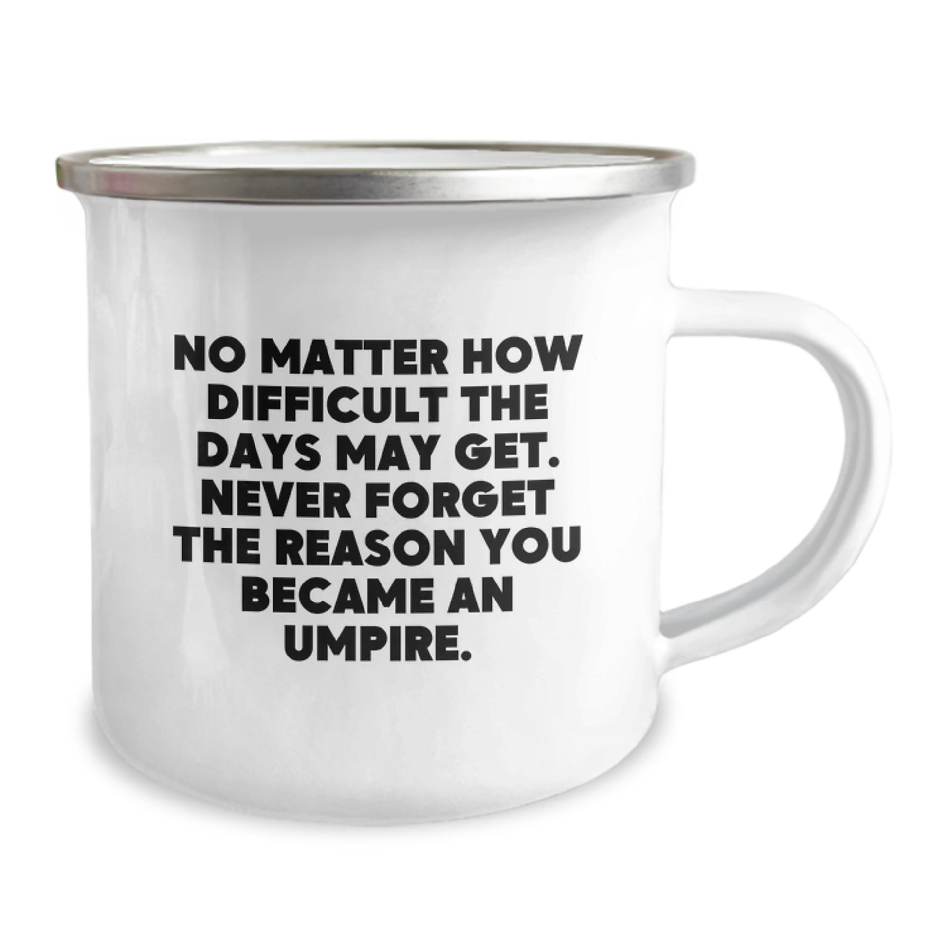 Are you an umpire enthusiast or looking for a thoughtful gift for the umpire in your life? Look no further! This inspirational quote camping mug is perfect for any occasion, especially birthdays. No matter how difficult the days may get, never forget the reason you became an umpire. This quote is a great reminder for all umpires to stay motivated and dedicated to their craft. The mug is made of stainless steel with an enamel finish, 12 oz capacity, and features permanent printing that won't fade after washing. Hand washing with mild detergent is recommended. Whether you're gifting it to a coworker, friend, or family member, this mug is sure to bring a smile to their face. So why wait? Get this amazing gift today!