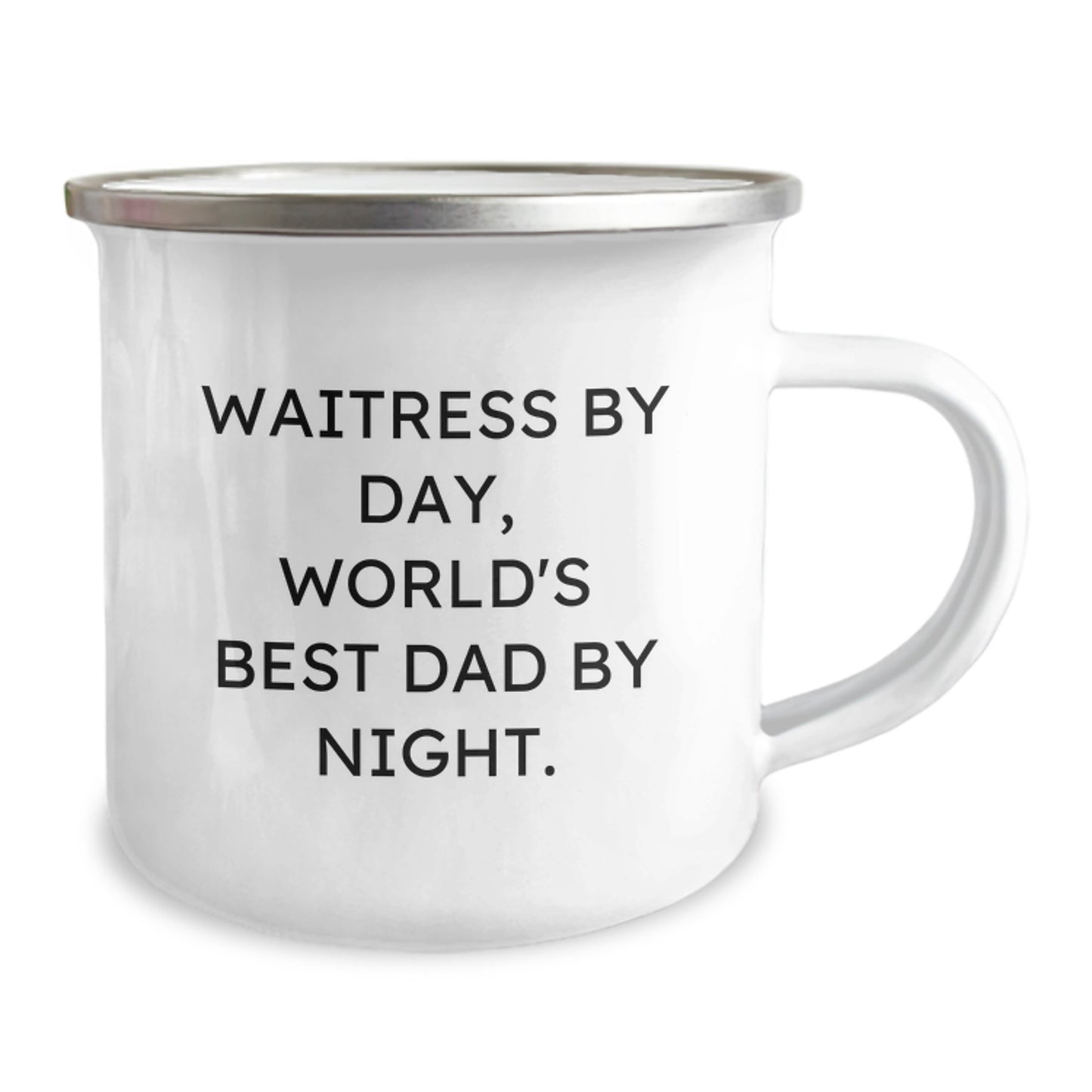 - Experience the perfect blend of style and functionality with our 'Waitress By Day, World's Best Dad By Night.' camping mug, perfect for the graduate in your life! Made from sturdy stainless steel with a vibrant enamel finish, this 12 oz capacity mug is designed for outdoor enthusiasts who demand the best. The permanent printing won't fade after washing, ensuring your message remains bold and bright.